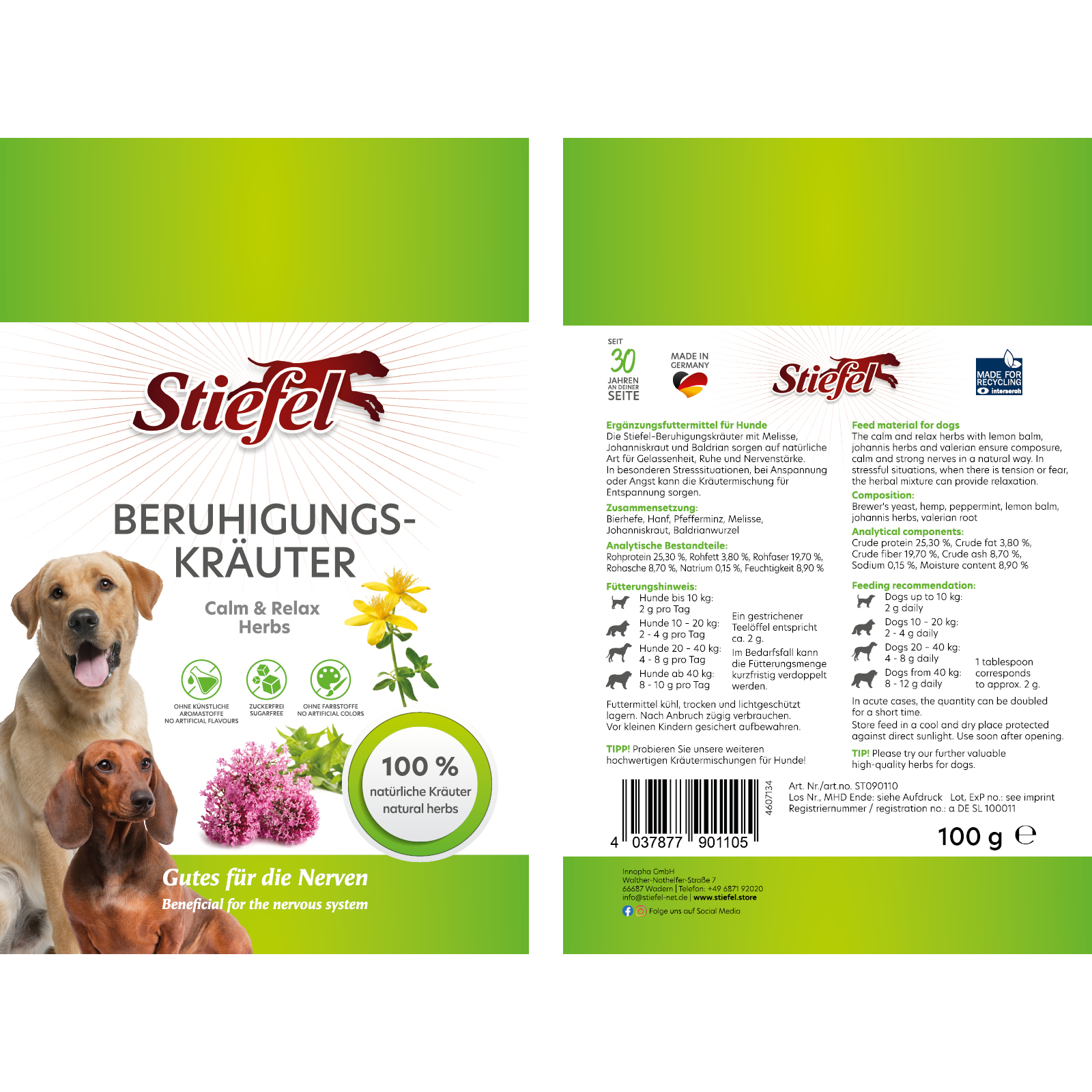 Stiefel Beruhigungskräuter enthalten Melisse, Johanniskraut und Baldrian und können auf natürliche Art für Unterstützung in besonderen Belastungssituationen sorgen. Vor allem nervöse und gereizte Hunde können unterstützt werden.
