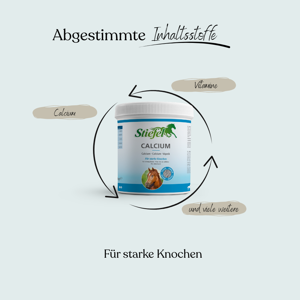 Stiefel Calcium kann zu einer guten Entwicklung bei Fohlen und Jungpferden beitragen. Stiefel Calcium kann auch bei älteren Pferden zum Ausgleich fütterungsbedingter Calcium-Mangelerscheinungen eingesetzt werden.