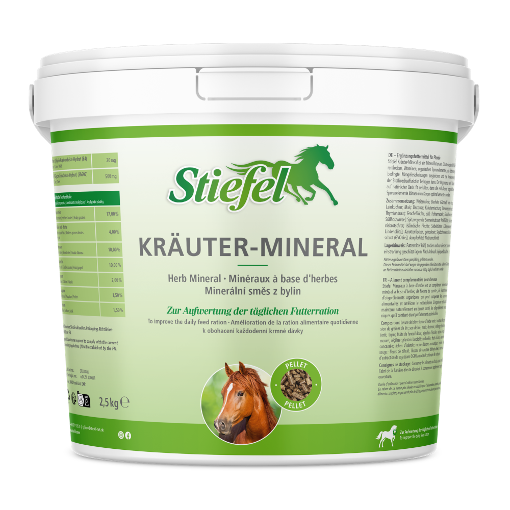 Stiefel Kräuter-Mineral ist ein Mineralfutter auf Kräuterbasis mit Möhrenflocken, Vitaminen, organisch gebundenen Spurenelementen, das fütterungsbedingte Mangelerscheinungen ausgleichen und zur Verbesserung der Stoffwechselfunktion beitragen kann. Der Organismus wird damit auf natürlicher Basis fit gehalten, denn die enthaltenen organisch gebundenen Spurenelemente können vom Körper optimal