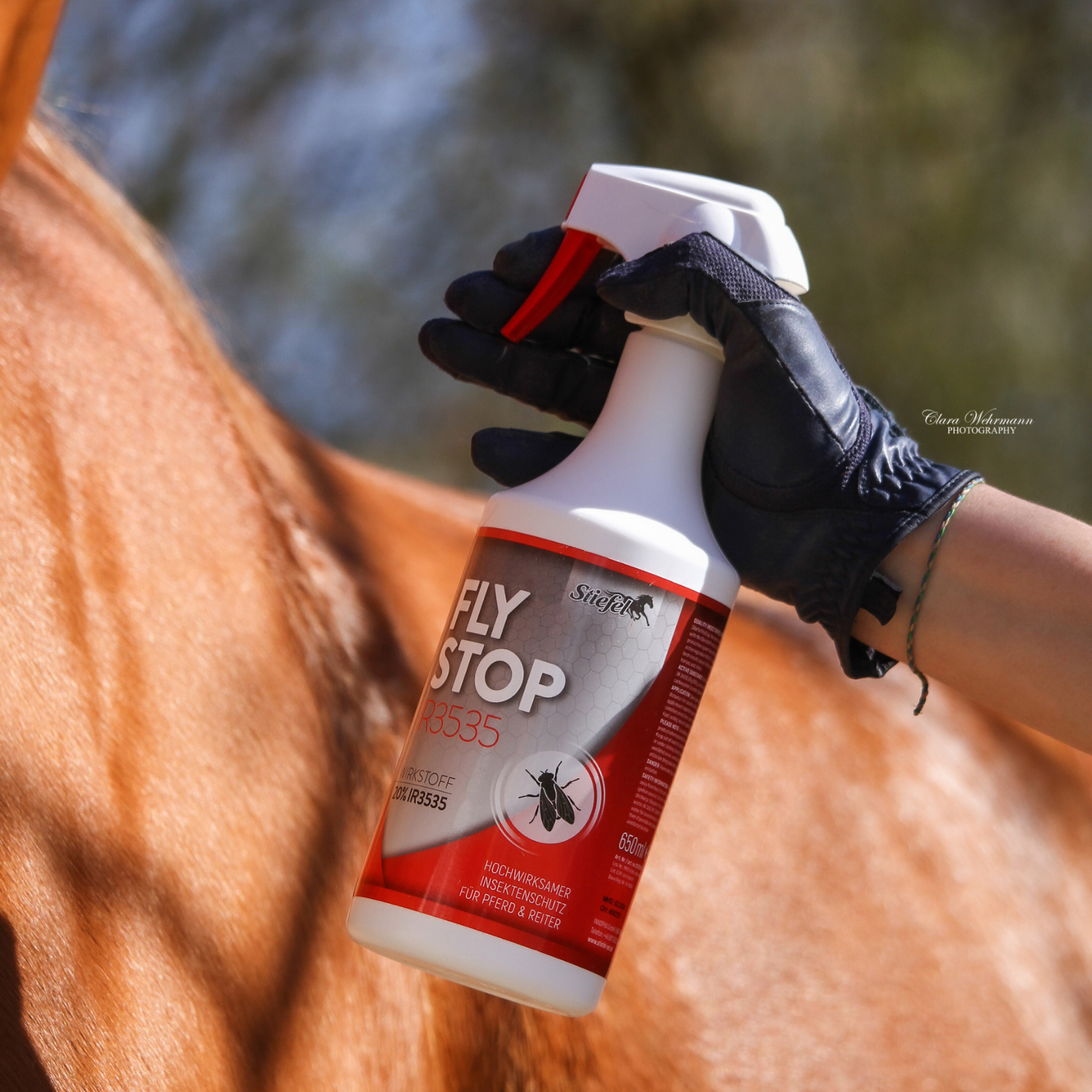 Aus ca. 25 cm Entfernung sparsam auf das Fell aufsprühen. Bei empfindlichen Pferden mit einem Lappen auftragen. Reiter tragen den Insektenschutz sparsam auf die Haut auf. Empfindliche Körperstellen (Augen, Ohren, Nüstern und Schleimhäute) aussparen. Der aktive Schutz tritt sofort ein. Spray zum Schutz gegen Insekten mit IR3535.