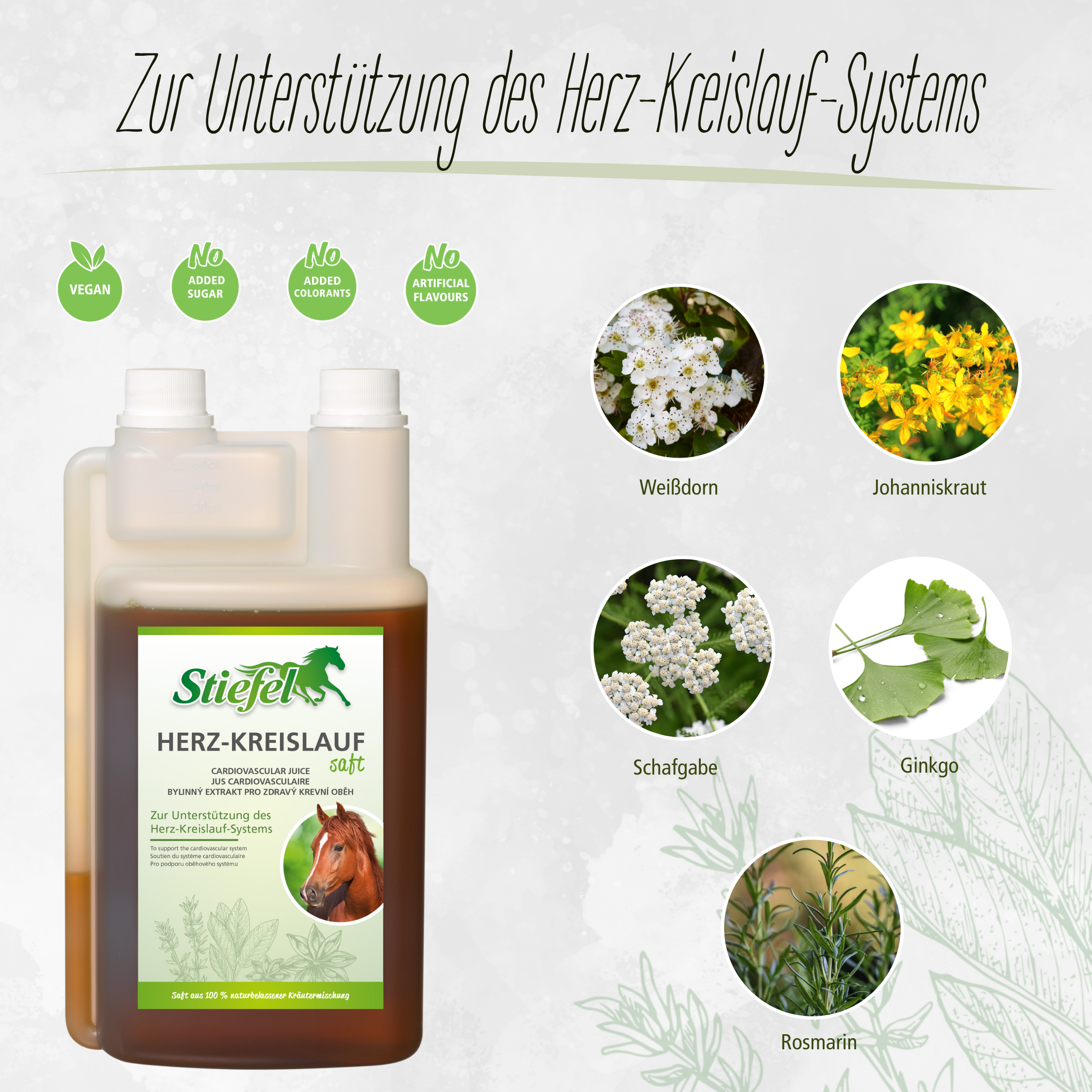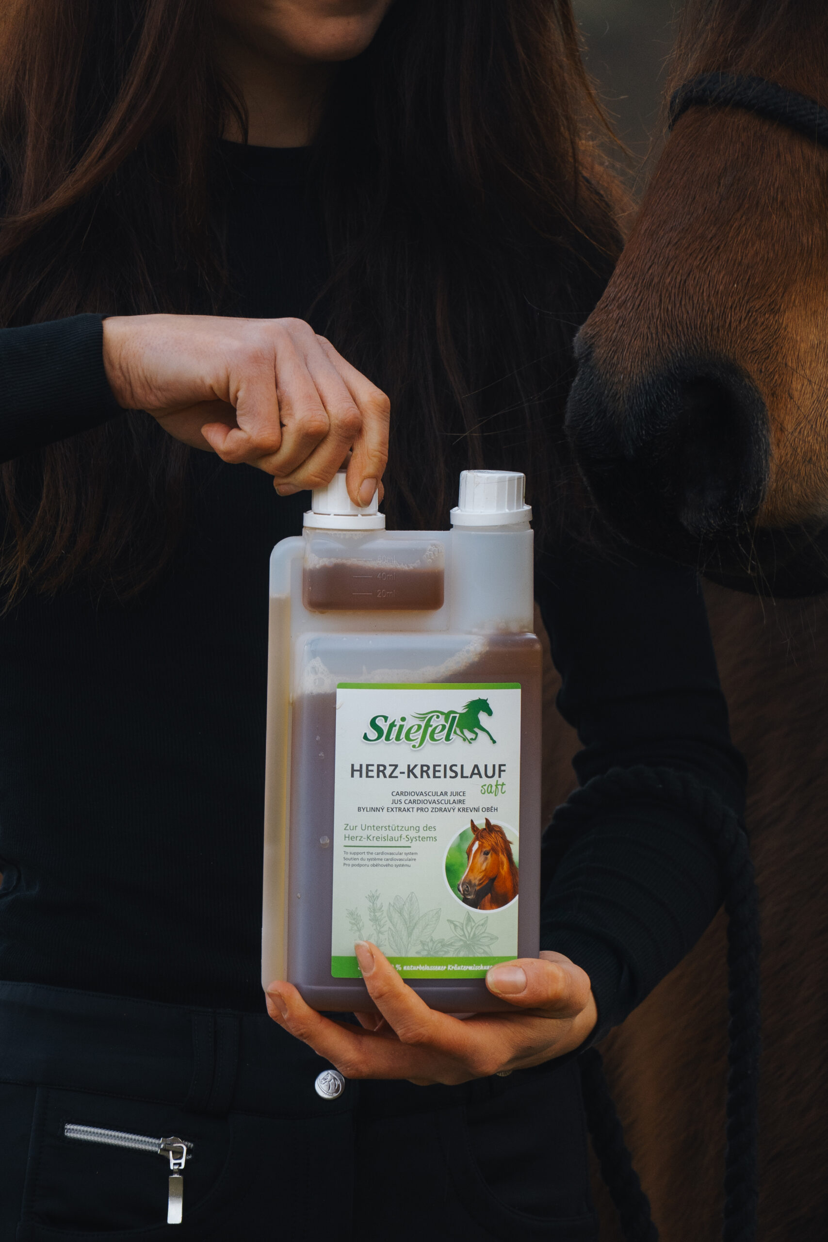 Stiefel Herz-Kreislauf-Saft enthält zu 100 % sorgfältig abgestimmte Kräuter, welche das allgemeine Wohlbefinden deines Pferdes unterstützen können und einen positiven Beitrag zu einem gesunden Kreislaufsystem leisten. Besonders ältere Pferde oder Tiere in Phasen erhöhter Beanspruchung können von der harmonisierenden Wirkung dieser Mischung profitieren.