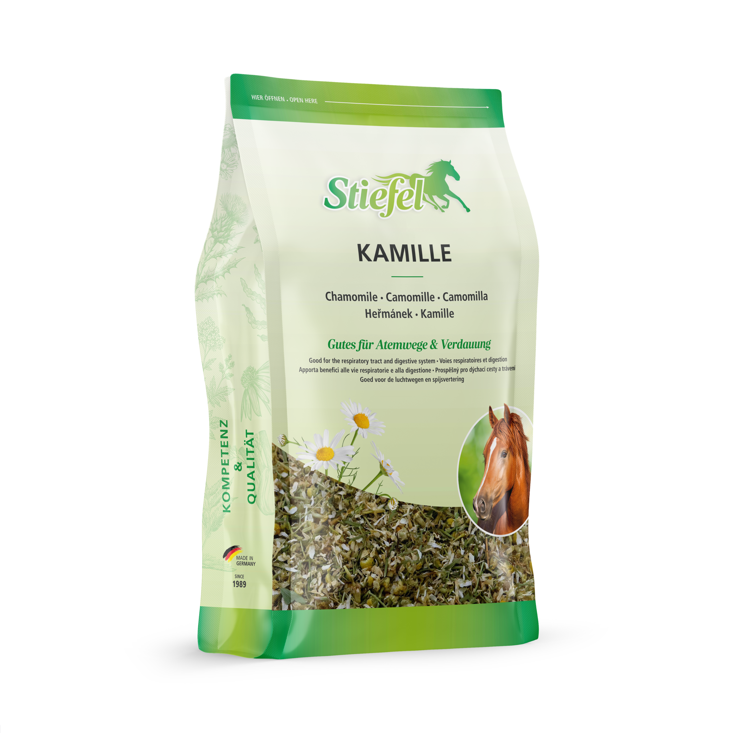 Stiefel Kamille kann sich unterstützend auf die Verdauungsorgane und beruhigend auf die Atemwege des Pferdes auswirken. Stiefel Kamille ist auch äußerlich zur Optimierung einer gesunden Hautfunktion und zur Hautpflege geeignet.