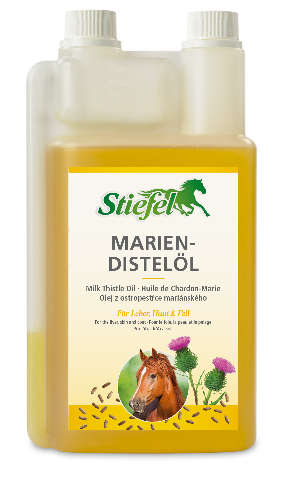 Stiefel Mariendistelöl ist ein 100% naturreines Öl. Mariendistelöl kann den Leberzellstoffwechsel anregen und damit die Gesundheit fördern. Das Öl kann sich ebenfalls positiv auf Haut und Fell des Pferdes auswirken.