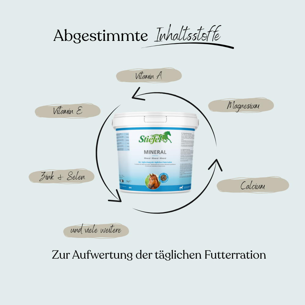 Stiefel Mineral kann fütterungsbedingten Mangelerscheinungen durch die hochwertige Grundversorgung mit Mineralstoffen und Vitaminen vorbeugen.