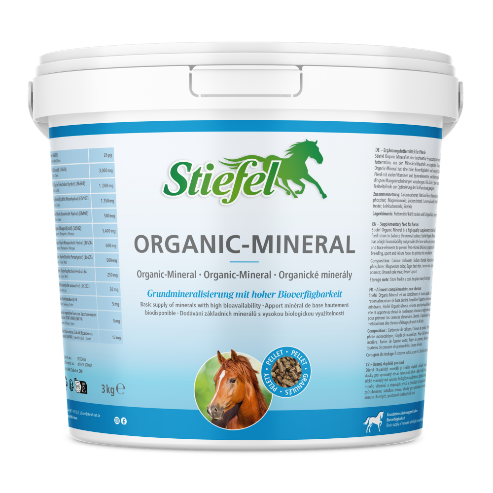 Stiefel Organic-Mineral ist eine hochwertige Ergänzung der Grundfutterration, um den Mineralstoffhaushalt auszugleichen. Stiefel Organic-Mineral hat eine hohe Bioverfügbarkeit und versorgt das Pferd mit vielen Vitaminen und Spurenelementen, um fütterungsbedingten Mangelerscheinungen vorzubeugen.