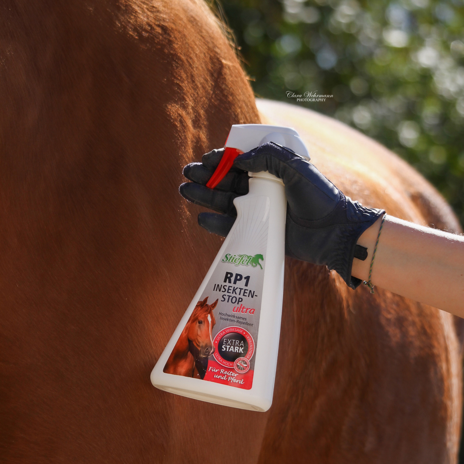 Beim Auftragen von RP1 auf das Fell bildet sich durch die flüchtigen Eigenschaften des Wirkstoffes eine dünne, schützende Duftwolke, die mehrere Stunden anhalten kann. Außerdem ist der Wirkstoff Icaridin® sehr gut hautverträglich und damit auch für den Reiter geeignet.
