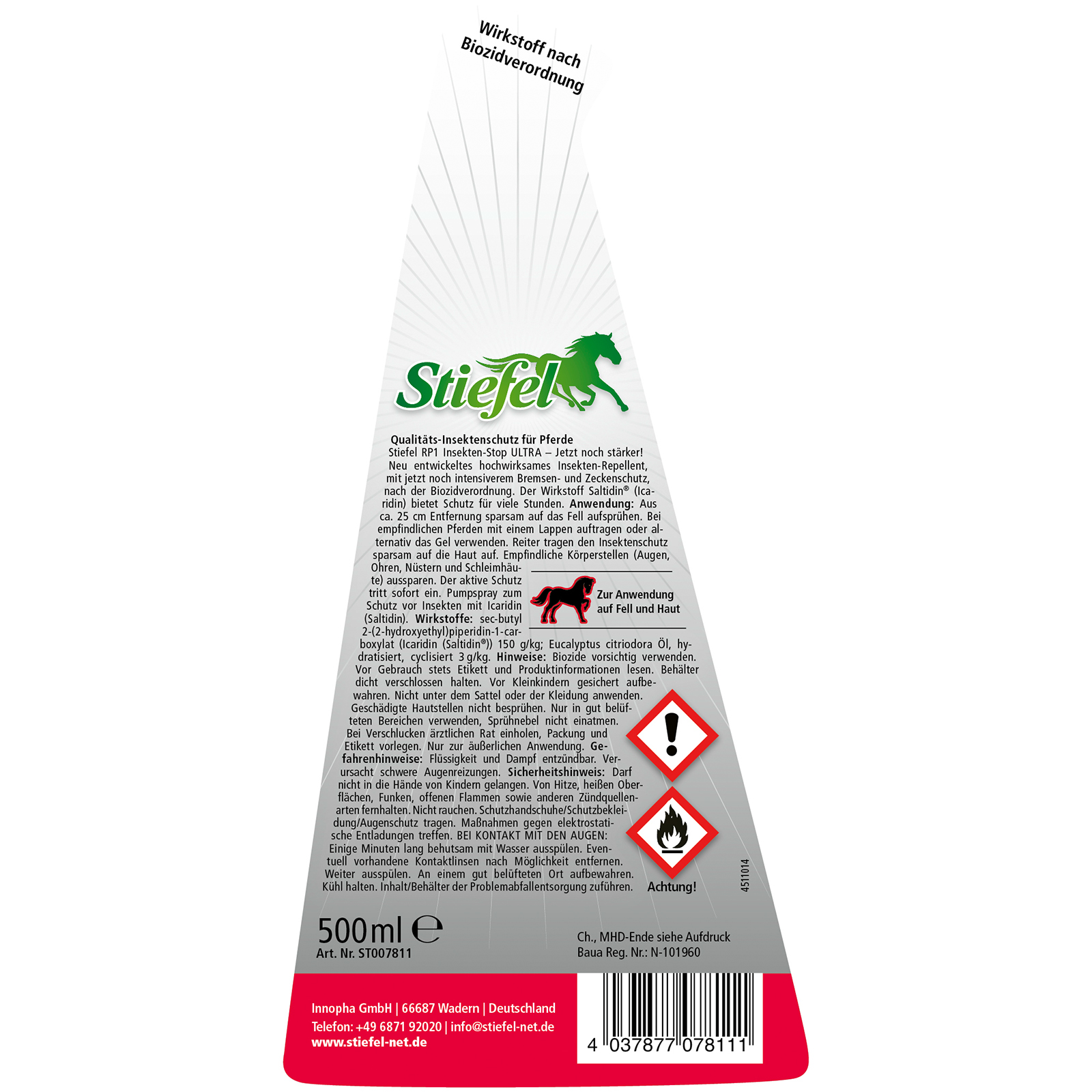 Stiefel RP1 Insekten-Stop Ultra ist ein hochwirksames Insekten-Repellent mit aktivem Zecken- und Insektenschutz nach Biozidverordnung mit einer erhöhten Wirkstoffkonzentration für langanhaltenden Schutz. Der enthaltene Wirkstoff Saltidin® (Icaridin) ist für uns Menschen beinahe geruchslos und belästigt weder Mensch noch Pferd nicht mit einem unangenehmen Geruch. Insekten hingegen nehmen Gerüche sensorisch wahr und werden von dem Repellent abgeschreckt.