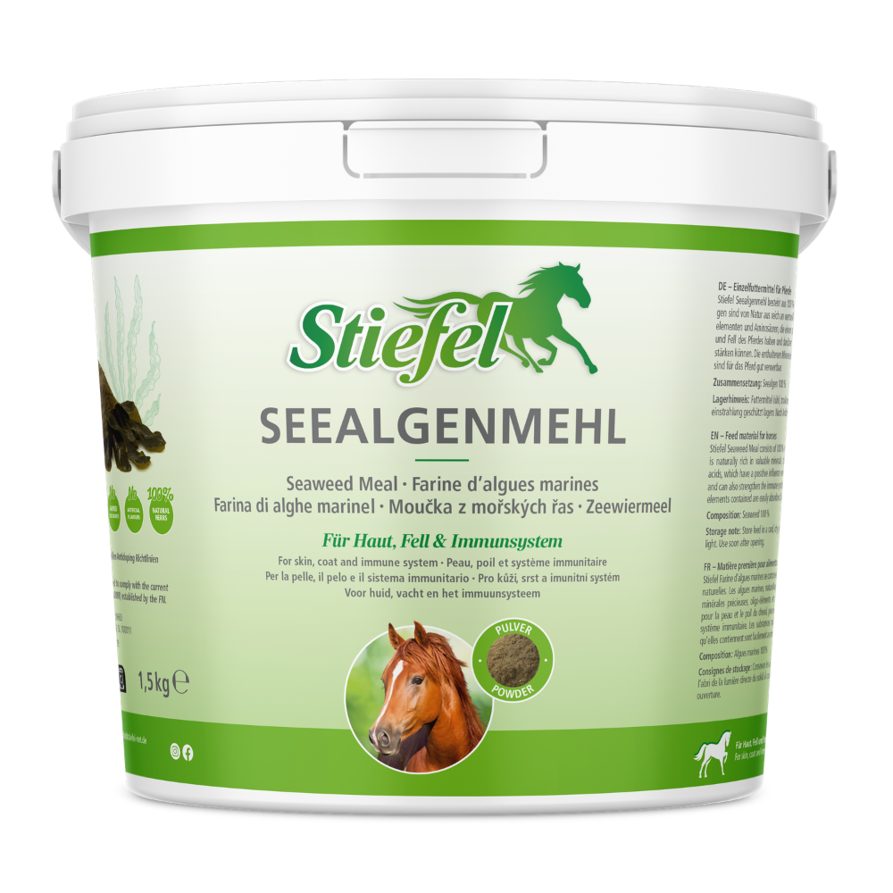 Stiefel Seealgenmehl besteht aus 100% natürlicher Seealge. Seealgen sind von Natur aus reich an wertvollen Mineralstoffen, Spurenelementen und Aminosäuren, die einen positiven Einfluss auf Haut und Fell des Pferdes haben und darüber hinaus das Immunsystem stärken können. Die enthaltenen Mineralstoffe und Spurenelemente sind für das Pferd gut verwertbar.