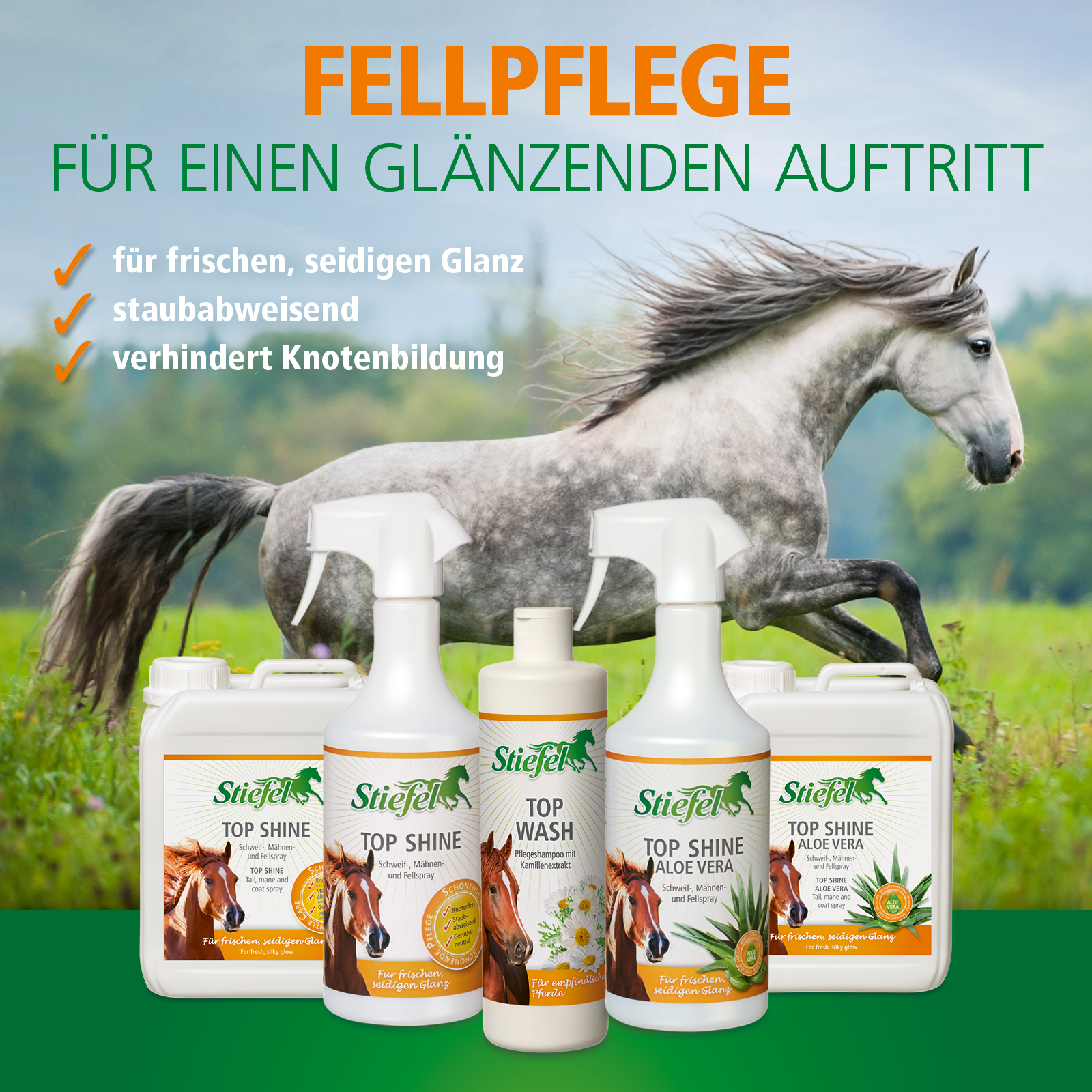 Stiefel Top Shine Aloe Vera ist die hochwertige Pflege für Fell, Mähne und Schweif des Pferdes. Durch die enthaltene Aloe Vera kann ein zusätzlicher Pflegeeffekt für gereizte Haut erreicht werden. Mähne und Schweif lassen sich leichter bürsten und von Knoten befreien. Das Fell wird schonend gepflegt und erhält einen seidigen Glanz. Der unsichtbare Schutzfilm, der Haare und Fell umgibt, kann staubabweisend wirken und eine erneuten Knotenbildung verhindern.
