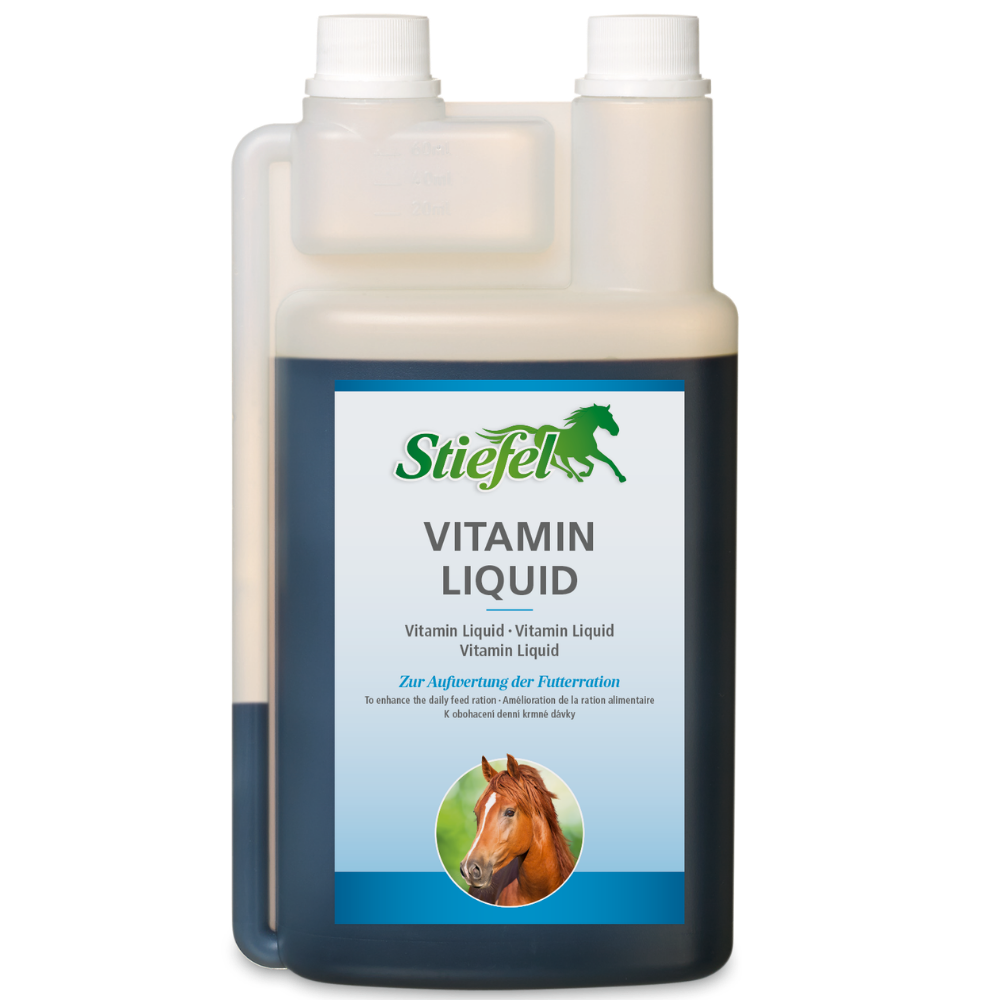 Stiefel Vitamin Liquid kann die tägliche Grundfutterration sinnvoll aufwerten. Die flüssige Kombination aus Vitaminen, Spurenelementen und Aminosäuren kann fütterungsbedingte Mangelerscheinungen dieser Stoffe ausgleichen und sich bei Sport-, Leistungs- und Zuchtpferden positiv auf den Allgemeinzustand auswirken.
