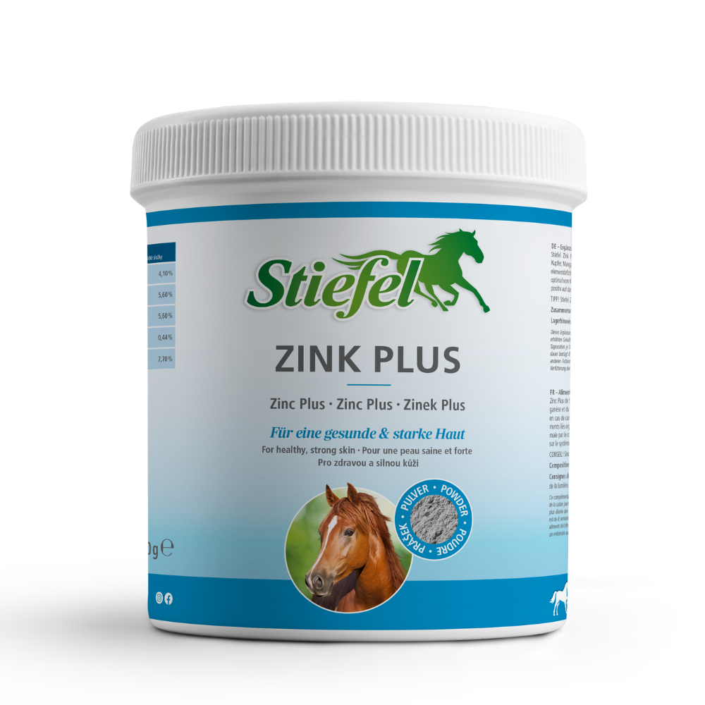 Stiefel Zink Plus enthält organisch gebundenes Zink, Eisen, Kupfer, Mangan und Selen zur Fütterung bei Zink- und Spurenelementdefiziten. Organisch gebundene Spurenelemente können optimal vom Körper verwertet werden. Stiefel Zink Plus kann sich positiv auf das Immunsystem sowie Haut und Horn auswirken.