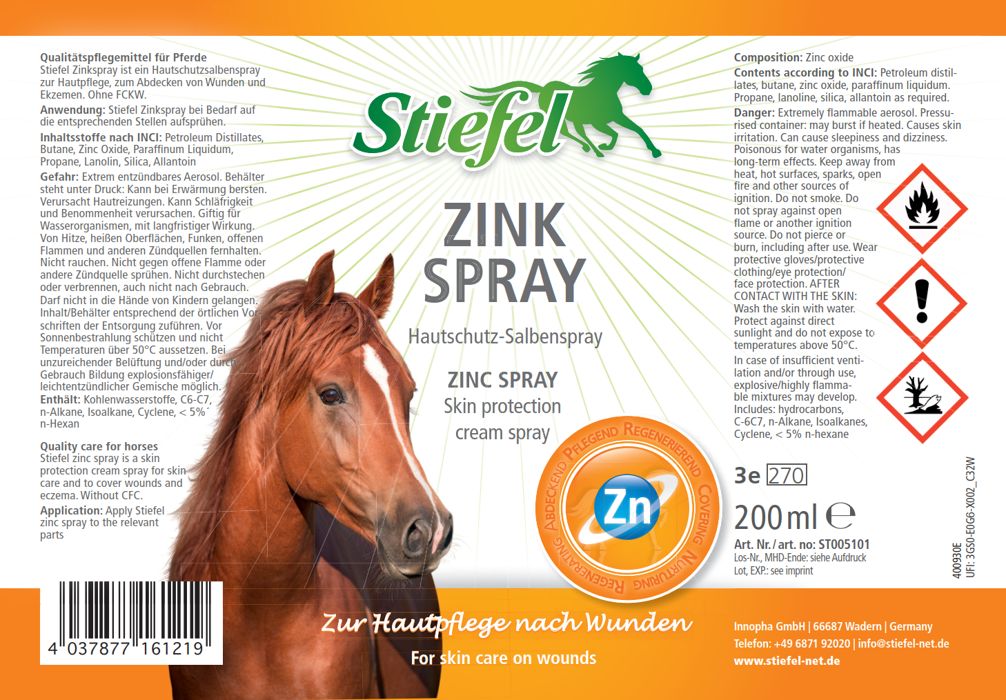 Stiefel Zinkspray ist ein Hautschutzsalbenspray mit Zinkoxid zum Abdecken von Wunden und Ekzemen. Für eine verbesserte und schnellere Regeneration der Haut ist Zink essentiell. In Form von Zinkoxid kann Zink die Bildung von neuem, gesundem Hautgewebe äußerlich unterstützen. Stiefel Zinkspray eignet sich daher optimal zur Abdeckung von betroffenen Hautstellen und hilft gleichzeitig das Eindringen von Keimen und Schmutz zu verhindern. Der Film, der sich über die Haut legt, ist atmungsaktiv und flexibel.